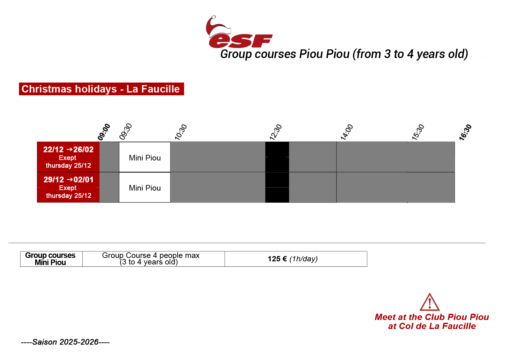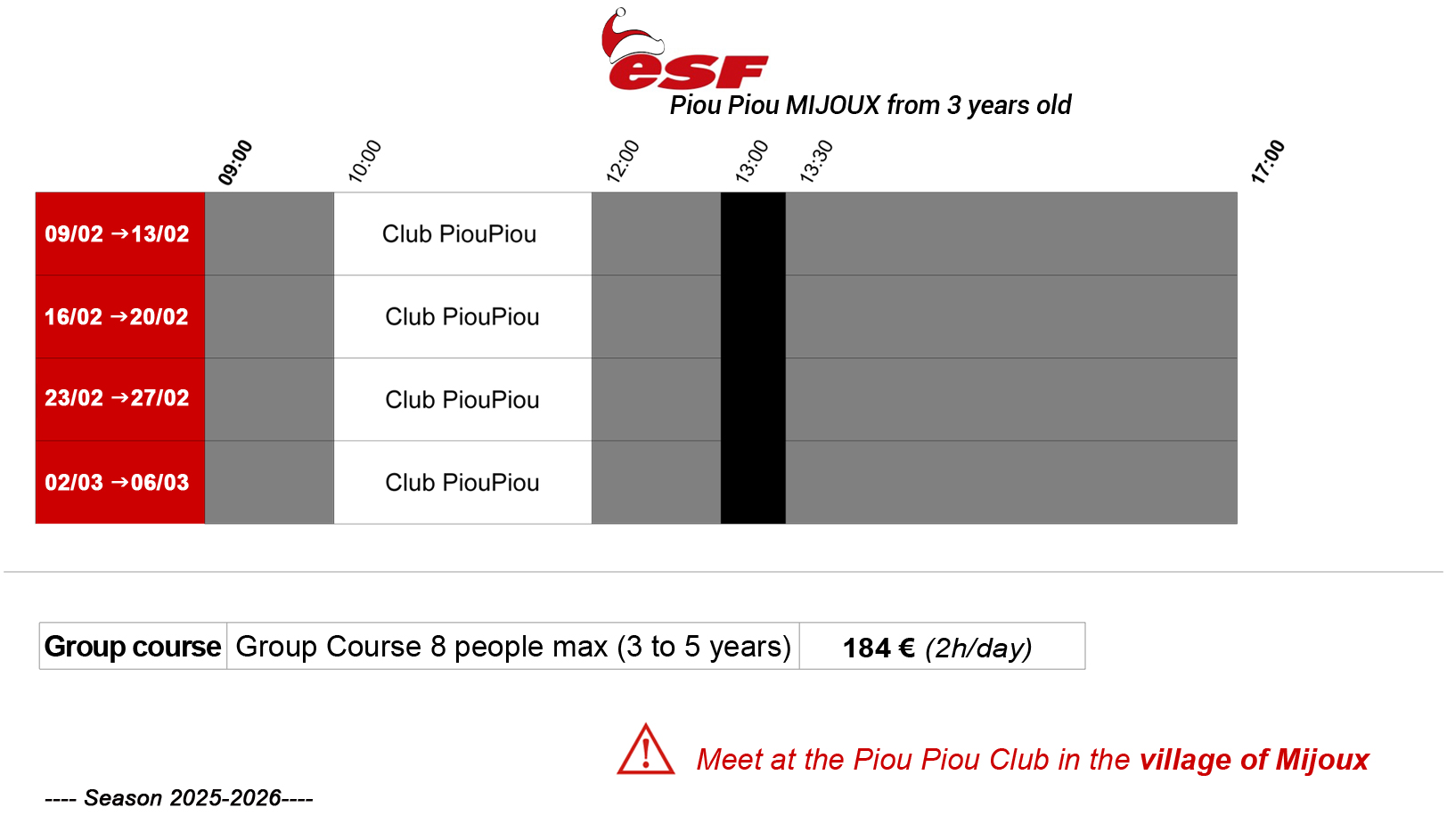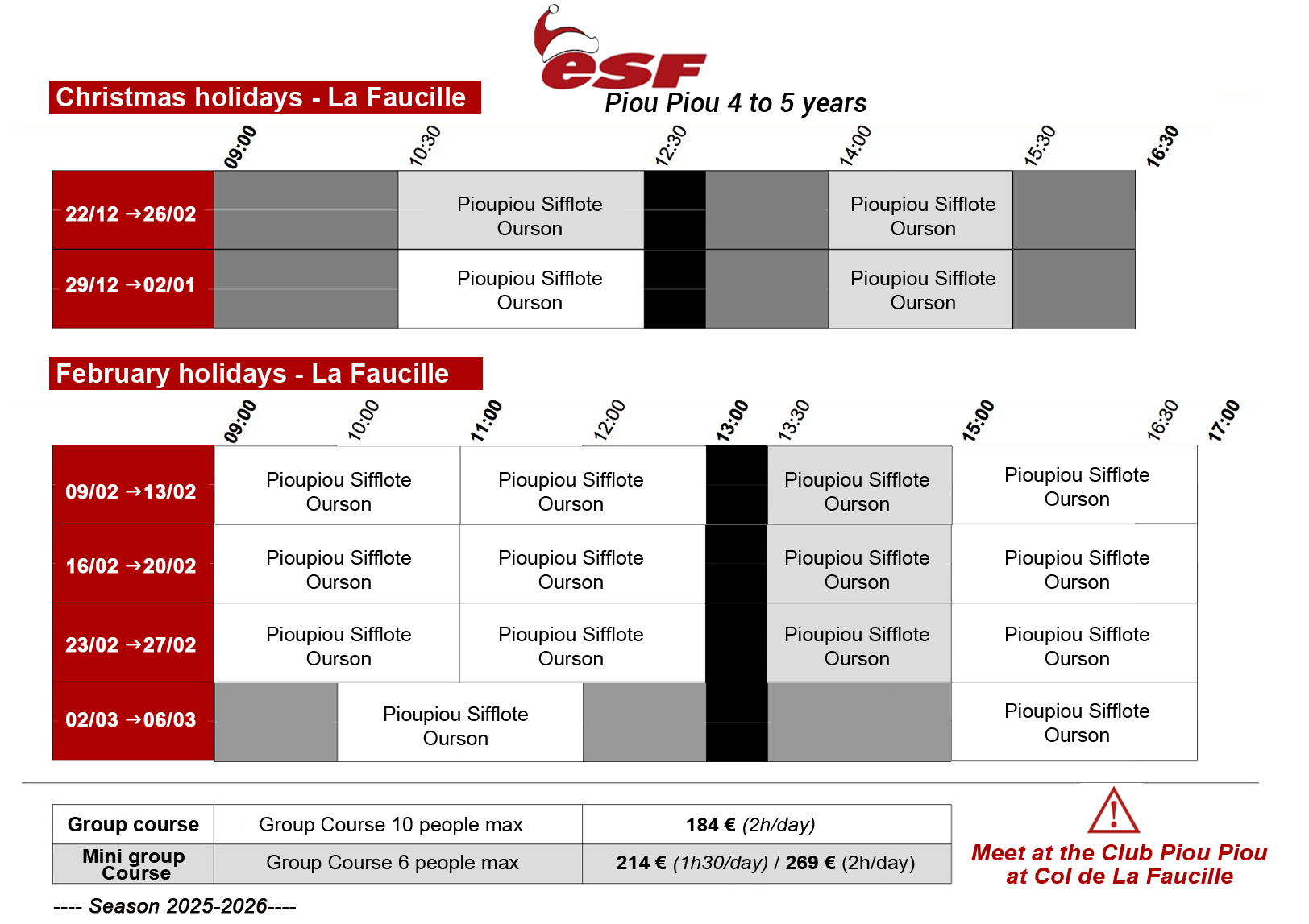 MIJOUX : BEGINER CHILD 3 to 5 years old Preparing Piou Piou, Sifflote LA FAUCILLE : CHILD 4 to 6 years old Preparing Piou Piou, Sifflote or Ourson |