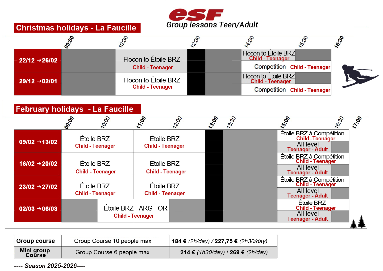 MEETING POINT : to the group lessons panels corresponding to your level, FACING ESF.