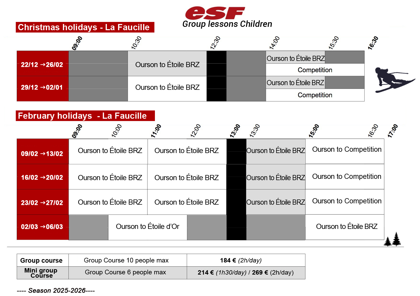 CHILDREN 5 TO 12 YEARS OLD Préparing, Ourson (+6 years), Flocon, 1st 2nd 3rd Star, Bronze, Silver & Gold Star, Flèches / Chamois. |
