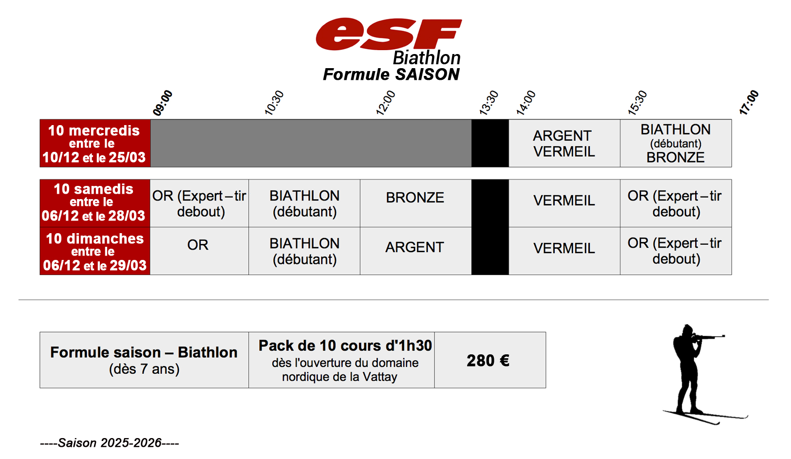 Inscription et paiement en ligne. La redevance ski de fond d’accès aux pistes est nécessaire. Merci de veiller à être assuré pour les conséquences des accidents liés à la pratique du ski (carré neige avec redevance). Vous présenter aux cours avec votre matériel de skating. Les carabines sont fournies. Soyez ponctuel. |