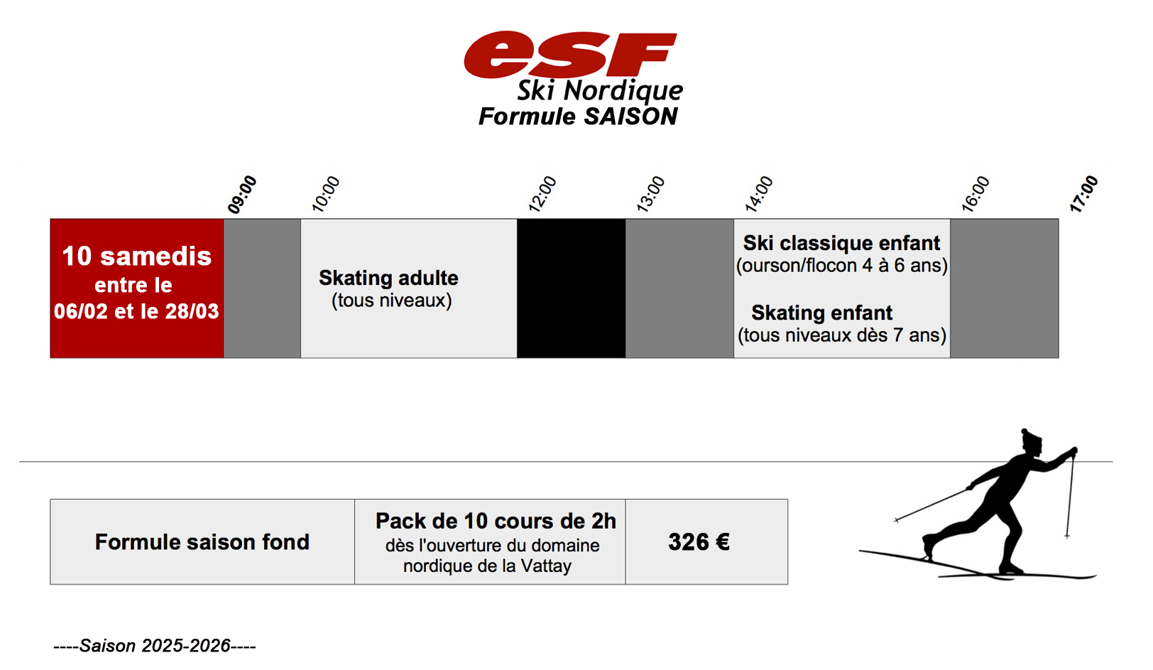 Inscription et paiement en ligne. La redevance ski de fond d’accès aux pistes est nécessaire Merci de veiller à être assuré pour les conséquences des accidents liés à la pratique du ski. Vous présenter aux cours avec votre matériel de skating ou d’alternatif. Merci de prendre toutes les dispositions les jours d’affluence, pour arriver à l’heure aux cours de ski. |
