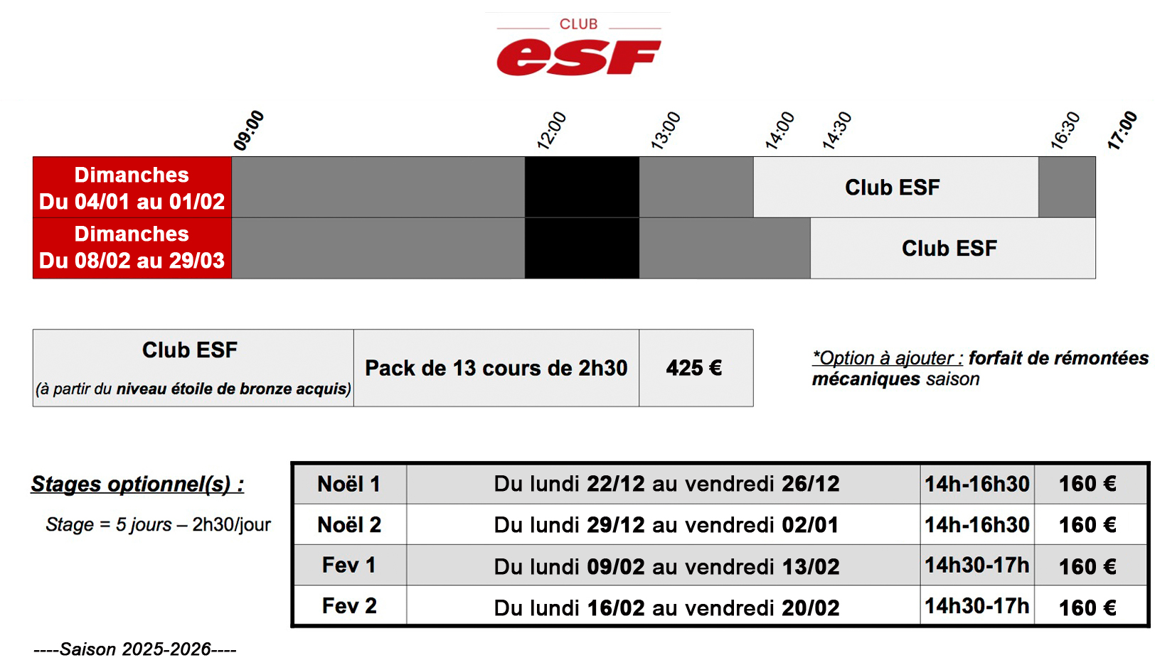Le club ESF est destiné aux enfant à partir du niveau Ourson acquis. Il s’agit d’un pack de 10 cours organisés le dimanche après-midi à partir du 11/01/26 jusqu’au 15/03/26. Le passage des niveaux s’effectue en contrôle continu tout au long de l’hiver.