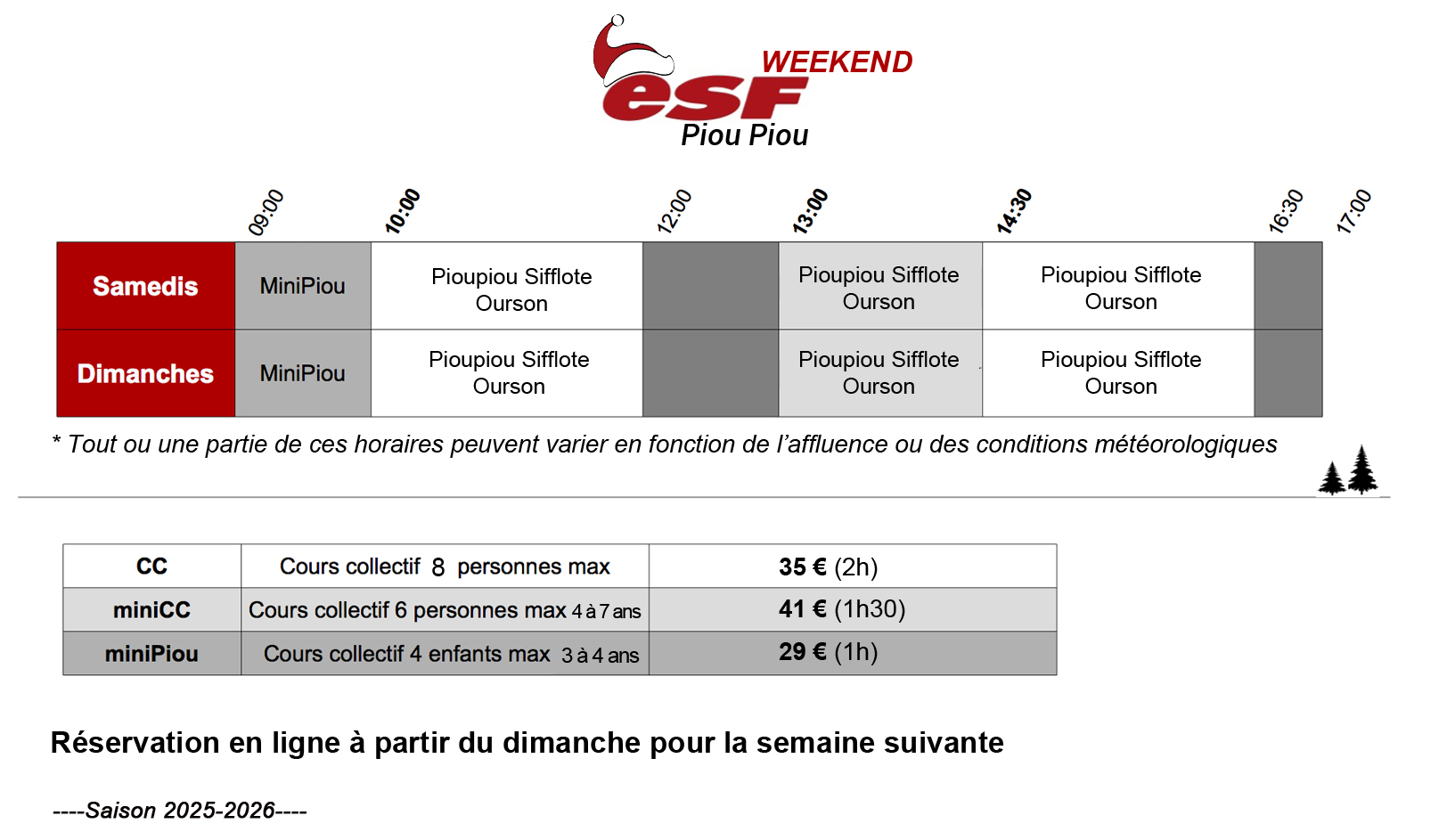 Un espace ludique d’initiation au ski réservé aux enfants entre 4 et 7 ans, aménagé de petits parcours variés, équipé d’un fil neige (remontée mécanique) spécialement conçu pour les plus petits. Les enfants sont encadrés par des moniteurs diplômés et des assistants. Inscription et payement en ligne : disponible le dimanche soir précédant le cours choisis. Les médailles Piou Piou, Sifflote, et Ourson sont acquises sous forme d’une évaluation continue, dès que l’enfant aura changé de groupe (jaune, bleue, violet) veuillez passer au bureau ESF pour récupérer l’attestation de niveau, une médaille vous sera proposée.